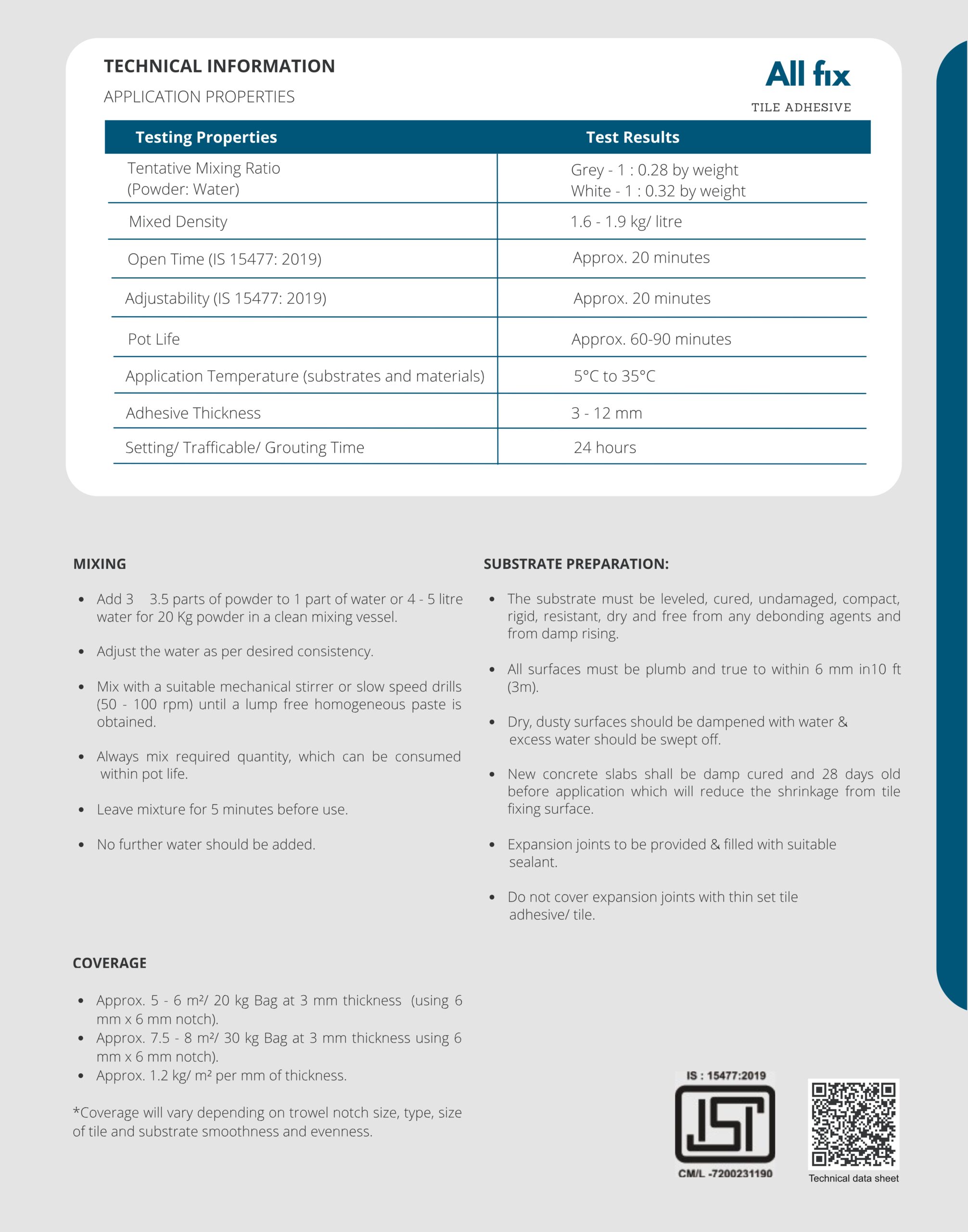- Approx. 5-6 m²/ 20 kg Bag at 3 mm thickness (using 6 mm x 6 mm notch).