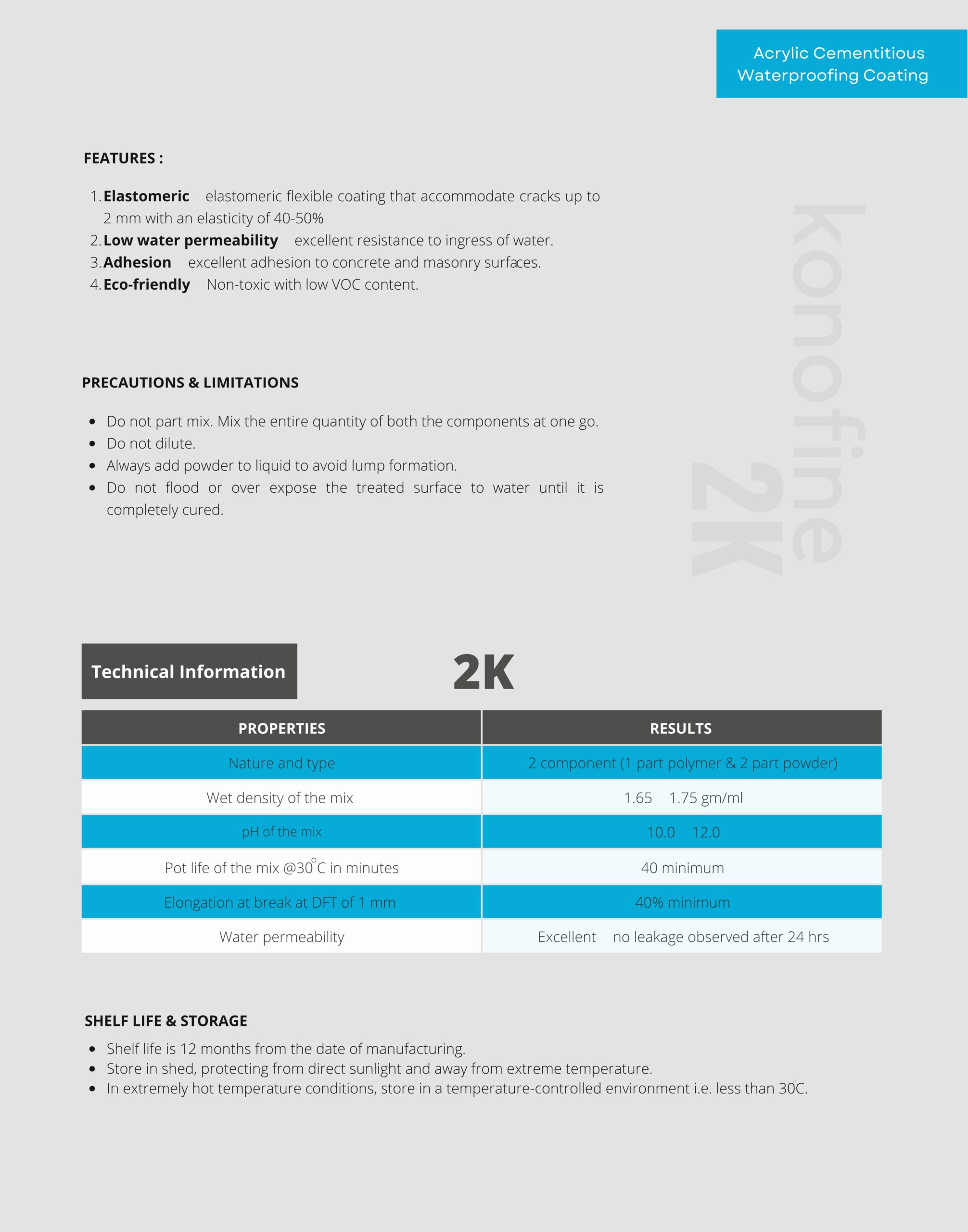 - Elastomeric elastomeric flexible coating that accommodate cracks up to 2 mm with an elasticity of 40-50%