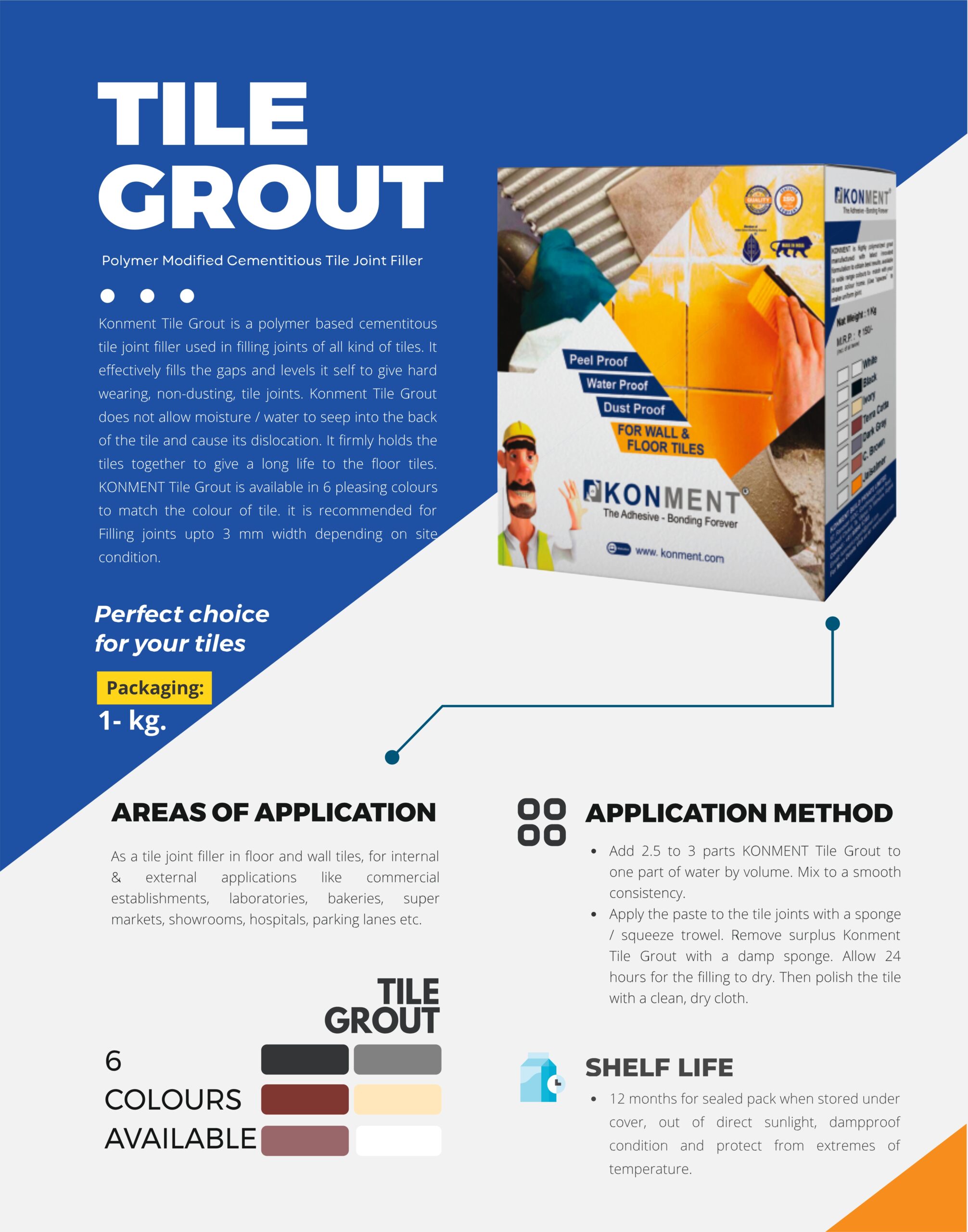 - Apply the paste to the tile joints with a sponge / squeeze trowel. Remove surplus Konment Tile Grout with a damp sponge. Allow 24 hours for the filling to dry. Then polish the tile with a clean, dry cloth. SHELF LIFE 12 months for sealed pack when stored under cover, out of direct sunlight, dampproof condition and protect from extremes of temperature.
